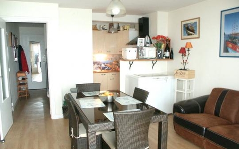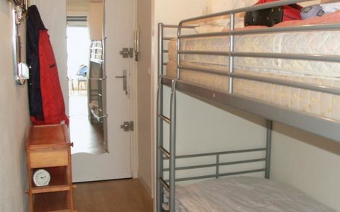 STUDIO cabine au 5ème étage (ascenseur) comprenant ENTREE et CABINE avec lits superposés, placard, SEJOUR (avec grand placard mural) sur BELLE TERRASSE FACE MER de 9,31 m², CUISINE ouverte meublée et équipée, SALLE d'EAU et wc (emplacement lave-linge).